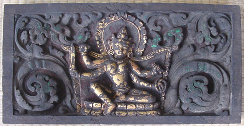 9. Gilded Wooden Door Panel of a Female Deity. 13th to 14th Century, Bhutan or Tibet. 15 1/4" (38.5 cm.) wide, 7 3/4" (19 cm.) high, 1" deep. One of the same series of panels from a temple door, this one is newer than the others and seems to be a 19th century replacement. The goddess is seated on a lotus and holds a bell and dorje, a sword and a rope in her four hands. See a similar one offered at Sotheby's in March, 2001.