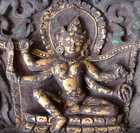 9. Gilded Wooden Door Panel of a Female Deity. 13th to 14th Century, Bhutan or Tibet. 15 1/4" (38.5 cm.) wide, 7 3/4" (19 cm.) high, 1" deep. One of the same series of panels from a temple door, this one is newer than the others and seems to be a 19th century replacement. The goddess is seated on a lotus and holds a bell and dorje, a sword and a rope in her four hands. See a similar one offered at Sotheby's in March, 2001.