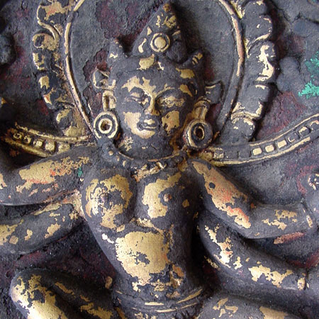 9. Gilded Wooden Door Panel of a Female Deity. 13th to 14th Century, Bhutan or Tibet. 15 1/4" (38.5 cm.) wide, 7 3/4" (19 cm.) high, 1" deep. One of the same series of panels from a temple door, this one is newer than the others and seems to be a 19th century replacement. The goddess is seated on a lotus and holds a bell and dorje, a sword and a rope in her four hands. See a similar one offered at Sotheby's in March, 2001.