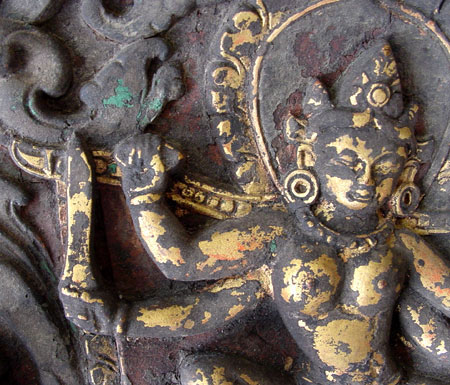 9. Gilded Wooden Door Panel of a Female Deity. 13th to 14th Century, Bhutan or Tibet. 15 1/4" (38.5 cm.) wide, 7 3/4" (19 cm.) high, 1" deep. One of the same series of panels from a temple door, this one is newer than the others and seems to be a 19th century replacement. The goddess is seated on a lotus and holds a bell and dorje, a sword and a rope in her four hands. See a similar one offered at Sotheby's in March, 2001.
