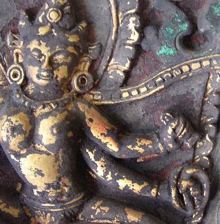 9. Gilded Wooden Door Panel of a Female Deity. 13th to 14th Century, Bhutan or Tibet. 15 1/4" (38.5 cm.) wide, 7" (18 cm.) high, 1" deep. One of a series of panels from a temple door. The goddess is seated on a lotus and holds a bell and dorje, a sword and a rope in her four hands. See a similar one offered at Sotheby's in March, 2001.