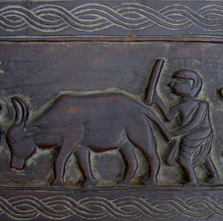 6. 19th Century Panel Showing Farm Life. Nepal, wood. 36" (91 cm.) long, 7" (17 cm.) tall, 3/4" (2 cm.) deep. Two farmers driving oxen, one milking a cow, birds a butterfly and a lizard. $275.