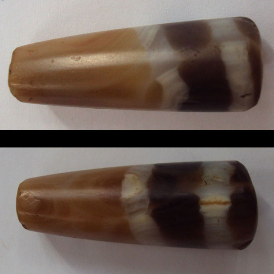 21. Part of an Ancient Large Chung Dzi. Tibet, ca. 1000 BCE to 1000 CE. This is half a bead that would have originally been more than 7 cm. long. It has been worn for many years as a dzi in its own right and the place where it is broken is worn smooth. There is a distinct crystalline eye on one side; this would be a striking center bead for a necklace. 35 mm. $300.