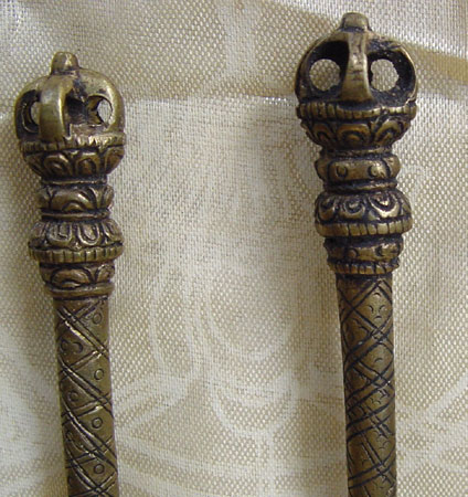 ![]() Click on the photo for to return to Daily Life. 13. Set of Surgical Implements. Tibet, mid-20th century. 12 gilded iron tools with brass dragon handles and set in a carved wooden case. Lengths of the tools: between 8" and 9" (20 to 23 cm.) The box closes on two hinges and measures 11" x 9" (28 x 23 cm.) when closed. SOLD.