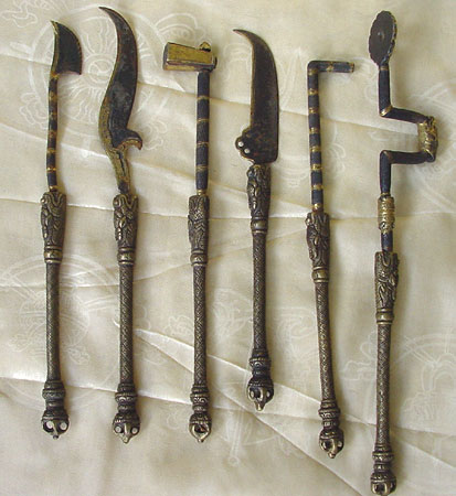 ![]() Click on the photo for the rest of the instruments without the box. 13. Set of Surgical Implements. Tibet, mid-20th century. 12 gilded iron tools with brass dragon handles and set in a carved wooden case. Lengths of the tools: between 8" and 9" (20 to 23 cm.) The box closes on two hinges and measures 11" x 9" (28 x 23 cm.) when closed. SOLD.
