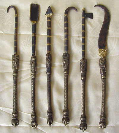 ![]() Click on the photo for some close ups. 13. Set of Surgical Implements. Tibet, mid-20th century. 12 gilded iron tools with brass dragon handles and set in a carved wooden case. Lengths of the tools: between 8" and 9" (20 to 23 cm.) The box closes on two hinges and measures 11" x 9" (28 x 23 cm.) when closed. SOLD.