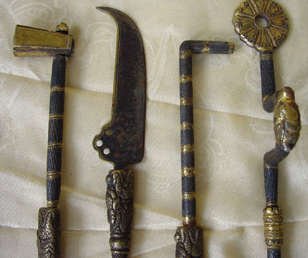 ![]() Click on the photo for some more close ups. 13. Set of Surgical Implements. Tibet, mid-20th century. 12 gilded iron tools with brass dragon handles and set in a carved wooden case. Lengths of the tools: between 8" and 9" (20 to 23 cm.) The box closes on two hinges and measures 11" x 9" (28 x 23 cm.) when closed. SOLD.