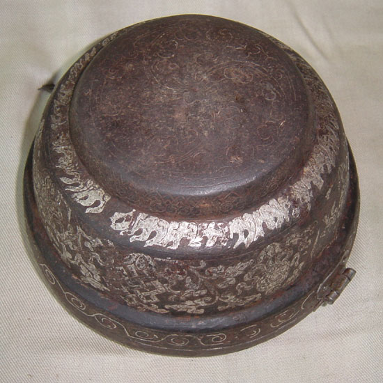 ![]() Click on the photo for a picture of the open holder. 3. Unusual Large Cupholder. Tibet. 19th Century. Iron with damascened silver, much of it worn away. This was once an elaborate piece with sacred symbols, leaves and flowers decorating the top and sides. 8 1/2" (22 cm.) diameter, 5" (12 cm.) high. $575.