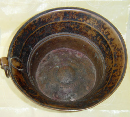 ![]() Click on the photo for another close-up. 18. 17th Century Copper Rice Measure Early 1600's, Nepal. With four kings' seals. Used for measuring grains in the marketplace, these measures are stamped with the king's seal when they are made, then they are re-certified every hundred years. It is very rare to find one this old. Heavy copper with a wonderful patina. The bottom once had 4 small feet; two are missing. 4 3/4" (12 cm.) high, 9 1/2" (24 cm.) in diameter. $425.